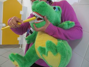 Natürlich wurde auch mit dem Dino geübt, wie richtiges Zähneputzen funktioniert.